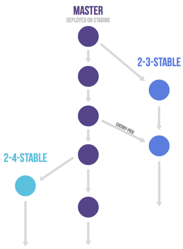 branch’e merge request oluşturulur ve cherry-pick ile master branch’e